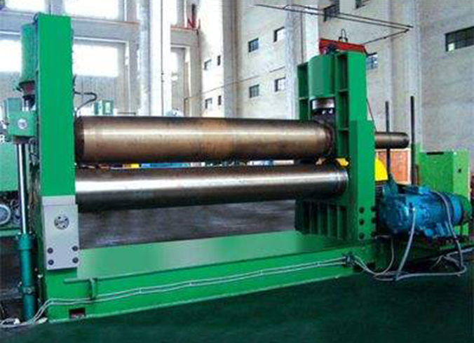 本機(jī)結(jié)構(gòu)型式為三錕對(duì)稱式,上輥在兩下輥中央對(duì)稱位置作垂直升降運(yùn)動(dòng),通過液壓缸內(nèi)的液壓油作用于活塞而獲得,為液壓傳動(dòng);兩下作旋轉(zhuǎn)運(yùn)動(dòng),通過減速機(jī)的輸出齒輪與下輥齒輪嚙合為卷制板材提供扭矩。本機(jī)床結(jié)構(gòu)緊,操作維修方便。